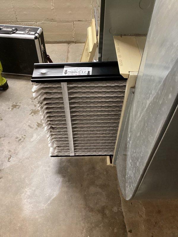 Performed MVP furnace maintenance service including inspection and documentation of existing air filters. Found current filters showing moderate dust accumulation but still in serviceable condition. Documented filter condition with photos for service record and future reference.