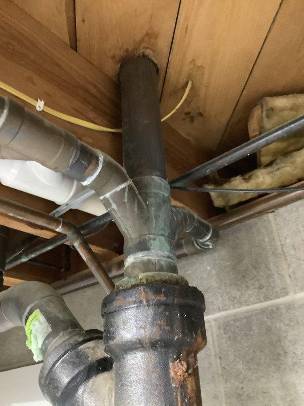 Responded to service call for leaking bathtub. Inspection revealed corroded cast iron drain pipe with significant rust at joint connection. Identified water damage on surrounding wooden subfloor. Repaired compromised pipe section to resolve leak.