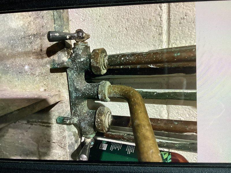 Inspected leaking humidifier system and identified significant corrosion and mineral buildup on copper pipe connections and central valve assembly. Also examined reported leaky cast iron faucet. Both issues showed advanced deterioration requiring replacement of affected components to resolve water leakage problems.