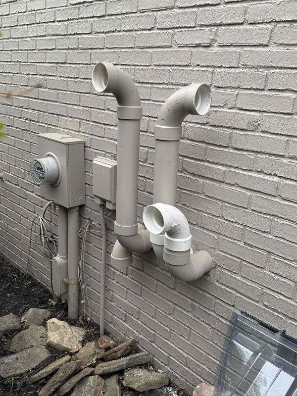 Completed warranty return trip to correct intake and exhaust pipe configuration on exterior wall-mounted PVC system. Swapped positioning of intake and exhaust pipes per manufacturer specifications, relocating exhaust pipe to upper position and intake pipe to lower position. Verified proper system operation and conducted AC performance test to confirm correct airflow and functionality.