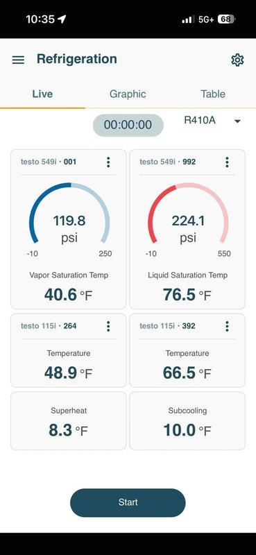 Performed warranty refrigerant top-off on R410A system. Verified system pressures and temperatures using digital manifold gauges, confirming proper superheat at 8.3°F and subcooling at 10.0°F after charging, with suction pressure at 119.8 psi and liquid line pressure at 224.1 psi.