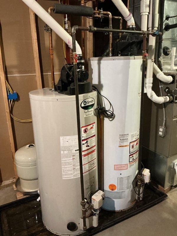 Responded to service call for leaking water heater with no hot water production in a 21-year-old residential property. Upon inspection, identified failed A.O. Smith tanked water heater showing active leak and inability to maintain temperature. Evaluated existing dual water heater system in basement mechanical room, including associated copper supply lines, brass shut-off valves, PVC venting system, expansion tank, and drainage pan configuration. Documented existing plumbing infrastructure and equipment condition through detailed photography for service records.