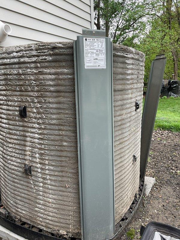 Completed scheduled BS-MVP cooling maintenance visit on residential air conditioning system. Performed comprehensive inspection of outdoor condensing unit, which showed normal weathering and dirt accumulation on corrugated metal fins. Verified electrical disconnect box operation and confirmed all manufacturer specifications were accessible and legible for future service reference.
