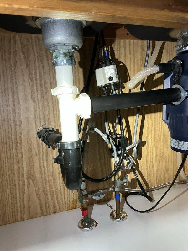 Responded to service call for kitchen faucet leakage under counter. Inspection revealed improper drain installation with misaligned P-trap assembly. Corrected the plumbing configuration by properly securing connections between the sink drain and disposal unit, replacing damaged gaskets, and verifying water supply line integrity at shut-off valves.