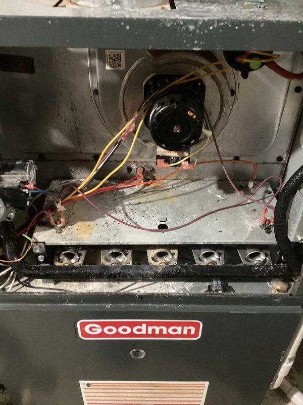 Performed scheduled maintenance on Goodman furnace system. Conducted thorough inspection of internal components including blower motor assembly, wiring connections, and heat exchanger. Noted dust accumulation on interior surfaces and burner ports; cleaned accessible components to ensure optimal performance.