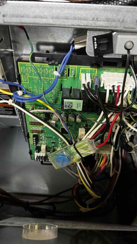 Performed annual furnace maintenance service, which included inspection of pleated air filtration system and control board assembly. Examined electronic components and wiring connections on PCB for proper functionality. Filter showed normal dust accumulation consistent with regular operation.