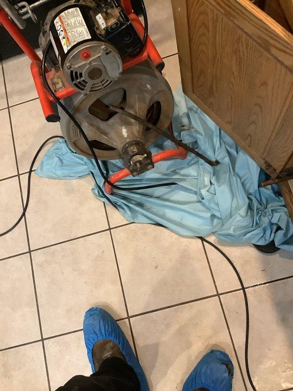 Responded to service call for clogged kitchen sink in 24-year-old residential property. Deployed professional-grade drain cleaning machine with snake attachment to clear blockage effectively, using protective floor covering to prevent damage during service. Successfully restored proper drainage function to kitchen sink.