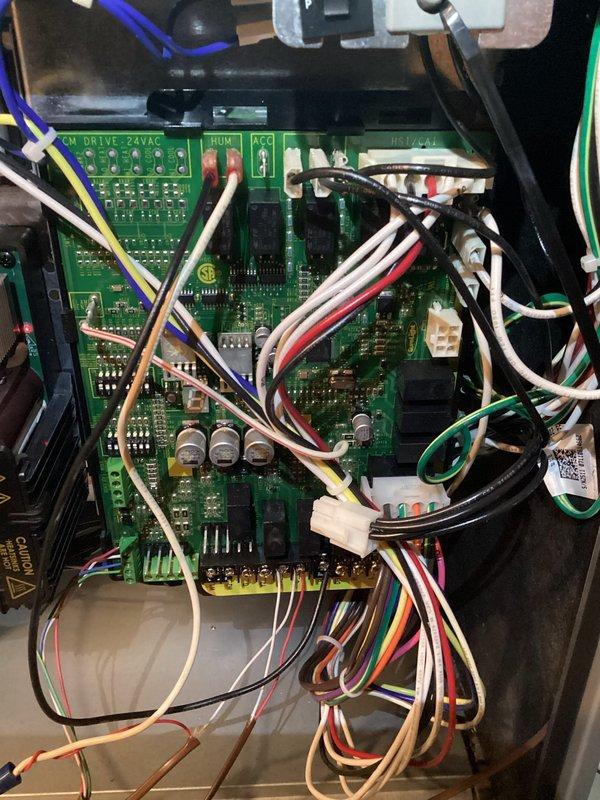 Performed warranty installation of replacement control board in HVAC system. Installed new PCB with multiple connection points including 24VAC drive, humidifier, and accessory terminals. Reconnected all wiring harnesses and verified proper system operation.