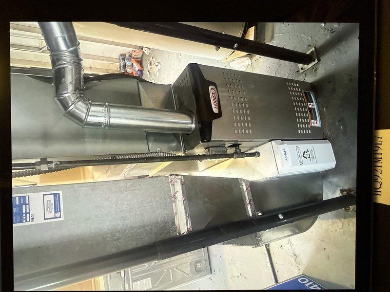 Completed replacement of 32-year-old furnace with new Armstrong Ultra SX model. System was properly installed in utility area with all necessary ductwork connections, including sealed metal elbow joints and flexible ducting. Final inspection confirmed proper installation with all manufacturer safety labels in place and system functioning as designed.