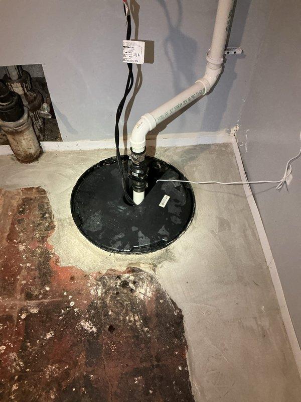 Installed new sump pump and check valve in basement utility area with significant moisture issues. Connected new system to existing PVC discharge pipe and electrical junction box. Observed substantial concrete deterioration and water damage around sump pit area, but completed installation with proper connections to ensure effective water drainage.