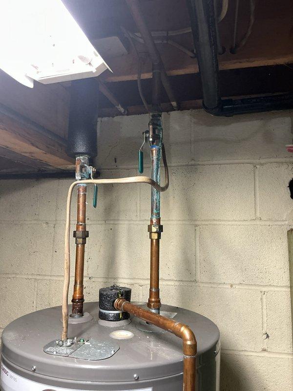 Diagnosed and repaired leak at bottom of tanked water heater in basement utility area. Inspected copper pipe connections and shut-off valves, confirming proper installation and functionality after repair. System now operating correctly with no signs of leakage.