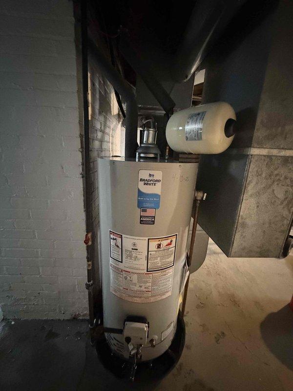 Responded to emergency flood condition in basement where over a foot of water had compromised the existing water heater's burner chamber. Removed and disposed of flood-damaged unit. Installed new Bradford White 40-gallon short water heater with 6-year manufacturer warranty. Installation included new ball valve for system isolation and thermal expansion tank to protect against pressure buildup. Verified all connections, tested system operation, and confirmed proper venting and drainage.