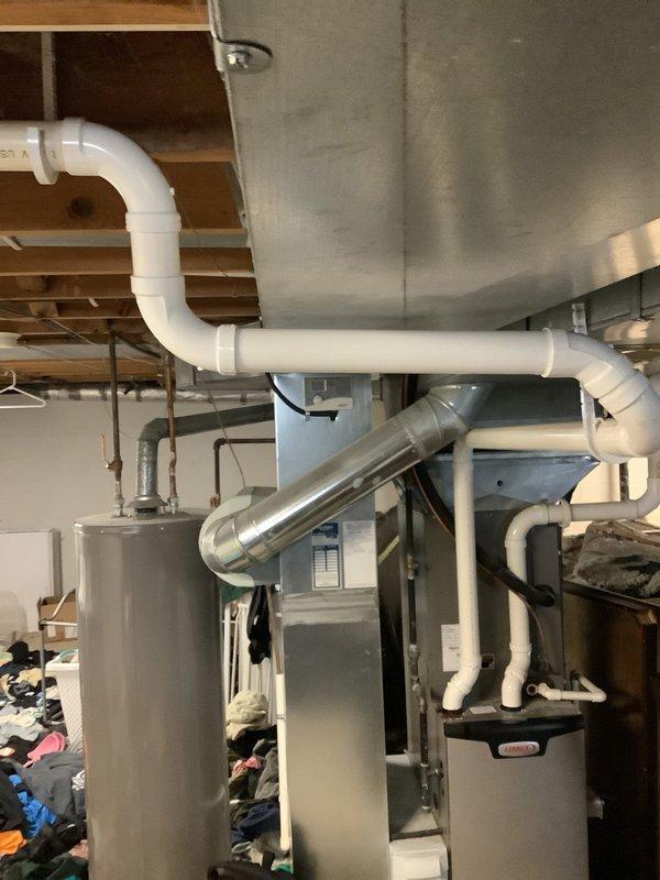 Successfully replaced deteriorated flue pipe on customer's HVAC system in basement mechanical room. Installation included proper fitting and securing of new metallic venting components to ensure safe exhaust flow from the furnace unit.