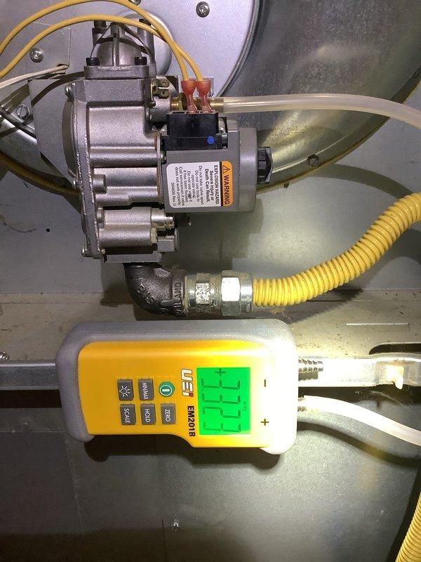 Diagnosed 22-year-old mobile home heating system not achieving setpoint temperature. Testing with UEI BM701B diagnostic tool revealed inadequate gas pressure at valve assembly. Adjusted gas pressure to manufacturer specifications, which restored proper heat output and system functionality.