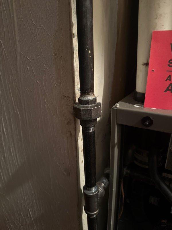 Responded to emergency service call for gas odor from recently installed PCB furnace. Inspected black iron gas pipe connections and fittings in mechanical room, which were found to be properly installed and intact with no active leaks detected. Customer was educated on normal break-in odors versus hazardous gas leaks.