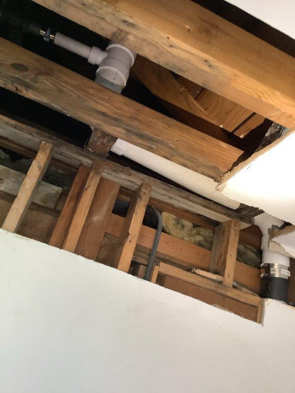 Replaced corroded section of stack vent by opening additional drywall to expose the vertical run and access sound pipe for proper connection. Removed deteriorated pipe at base and installed new section, securing connection to structurally intact portion of existing stack. Documented existing conditions showing exposed framing, PVC drainage components, and insulation in ceiling cavity prior to repair completion.