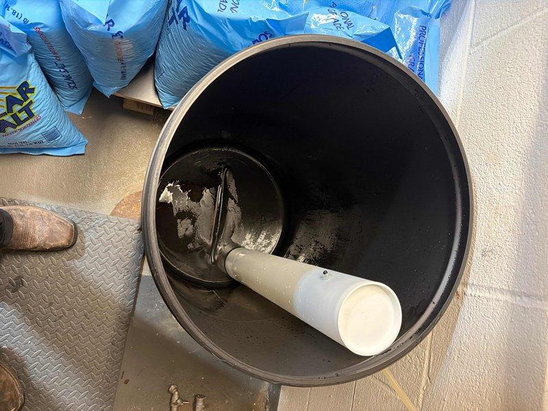 Performed brine tank cleaning service as requested by Craig. Inspected and cleaned interior surfaces of cylindrical brine tank, removing residue buildup. Verified proper positioning and function of internal PVC pipe components of the water treatment system.