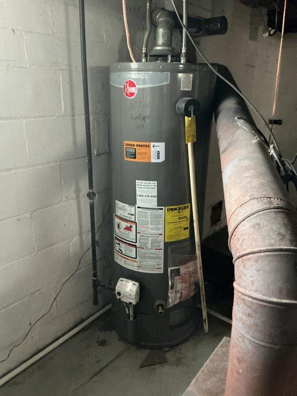 Responded to service call for Rheem water heater issues. Performed diagnostic inspection of the tank unit and determined there was no main valve pressure. No repairs were possible due to unit condition; recommended complete water heater replacement.