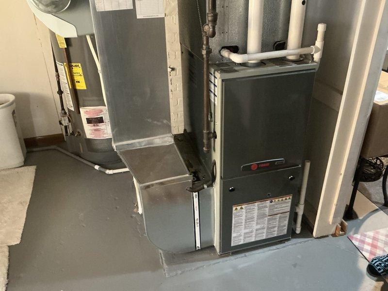 Completed inspection of 13-year-old Trane furnace in basement mechanical room. Assessed unit, connected ductwork, and drainage system for replacement quote #02058-05. Equipment shows normal wear consistent with age; customer advised on replacement options with BB 89 system.