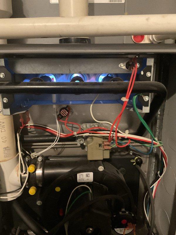 Performed follow-up service on 16-year-old furnace with unresolved issues from previous visit. Inspection revealed active gas burners with proper blue flame pattern, but aging PCB (printed circuit board) was identified as the root cause of system malfunction. Documented condition with photographic evidence for customer records.