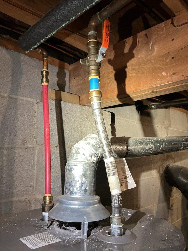 Successfully replaced leaking 2018 Rheem water heater with new Bradford White 40-gallon unit featuring 6-year manufacturer warranty. Completed comprehensive installation with hard-piped water connections, new ball valve, expansion tank, and bonding wire, while also rebuilding the gas line system with a new tee to provide dedicated shut-off valves for both water heater and stove.