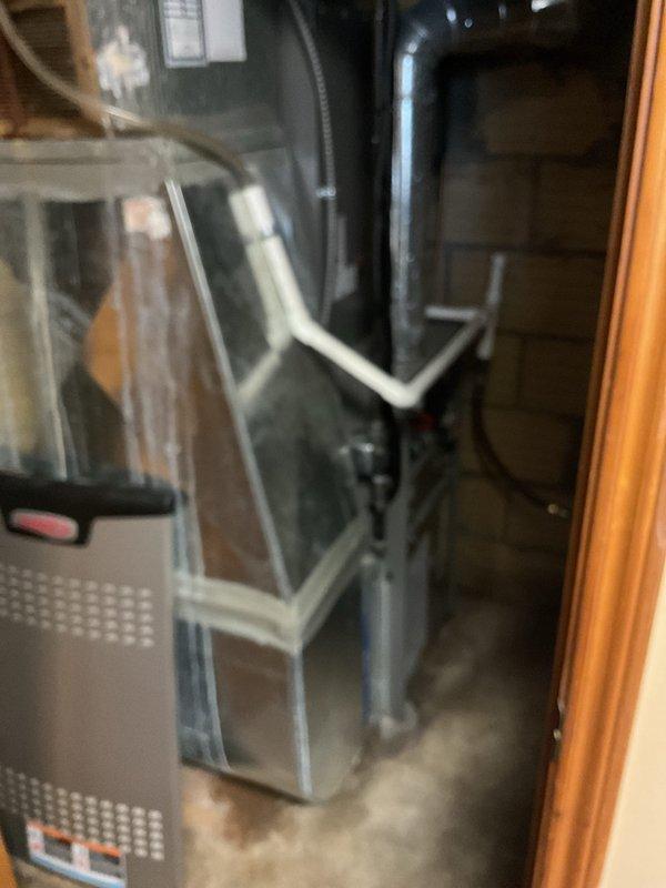 Responded to a no-heat call where a humidifier water line leak had infiltrated the furnace system. Conducted diagnostic inspection of the utility room equipment, documenting the condition of the furnace, ductwork, and surrounding mechanical components to assess water damage extent.