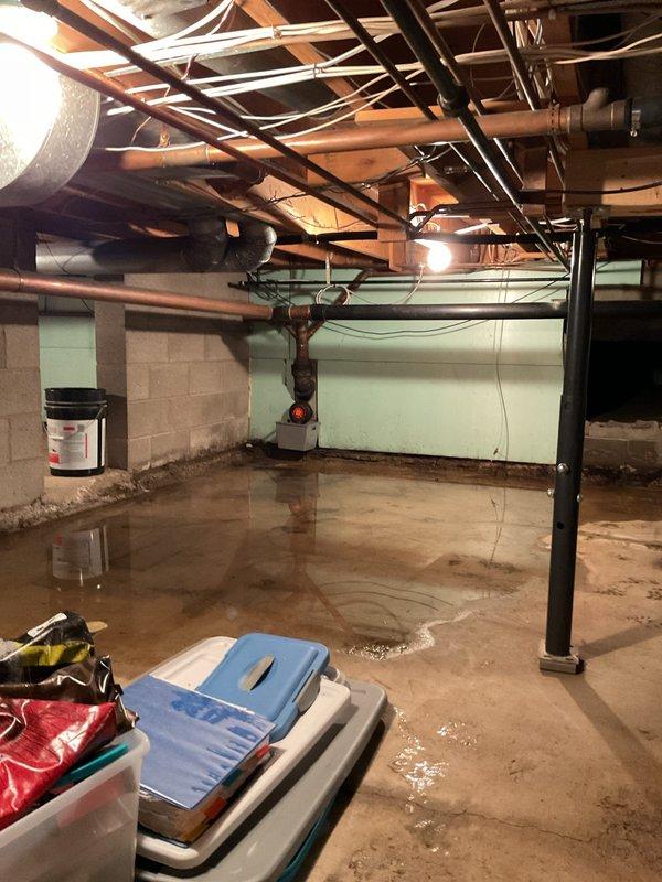 Responded to service call for sump pump backup issues. Upon inspection, found sump pump experiencing recurring drainage problems despite previous flushing attempts. Evaluated sump pump assembly, discharge piping, and check valve system for blockages or mechanical failure. Assessed condition of existing pump motor and float switch operation. Photographed installation showing sump basin, electrical connections, copper and PVC discharge lines, and associated plumbing infrastructure in basement utility area. Discussed diagnostic findings with customer and provided recommendations for either snaking the discharge line to clear potential obstruction or replacing the sump pump unit depending on severity of blockage and pump condition.