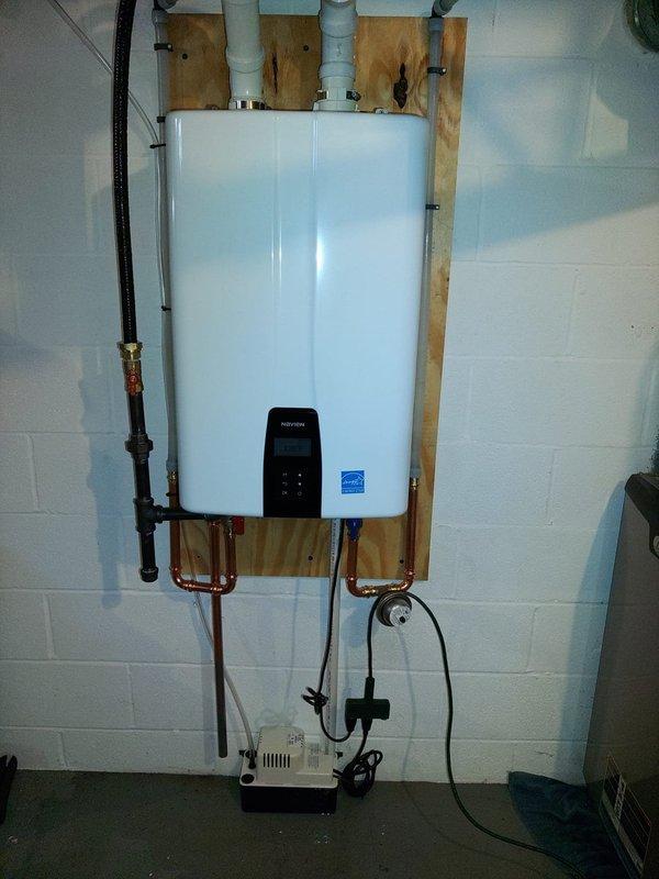Successfully installed a new Energy Star-rated tankless water heater unit on a concrete block wall within a wooden frame backing structure. The installation included all necessary connections: PVC venting routed through the top of the unit, copper water supply lines along the left side and bottom, gas line connections, and a condensate pump with electrical connections at the base of the unit. All components were properly secured, piping was organized and routed efficiently, and the system was tested to ensure proper operation and code compliance.