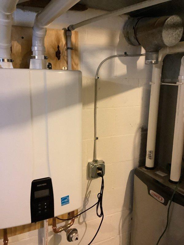 Installed dedicated electrical circuit for Navien tankless water heater unit in basement mechanical room. Ran metal conduit from main electrical panel to junction box mounted on concrete block wall, providing proper power supply for unit operation. Completed all wiring connections in accordance with manufacturer specifications and local electrical codes to ensure safe and reliable operation of the tankless water heating system.