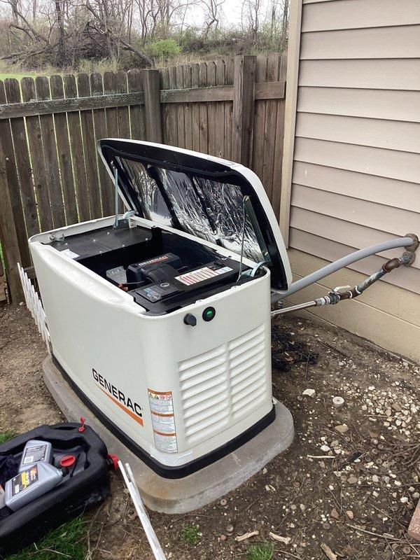 Performed scheduled maintenance tune-up on a white Generac residential standby generator approximately 5 years old. Conducted comprehensive inspection of engine components, control panel, and external housing with all systems operating within normal parameters upon completion.