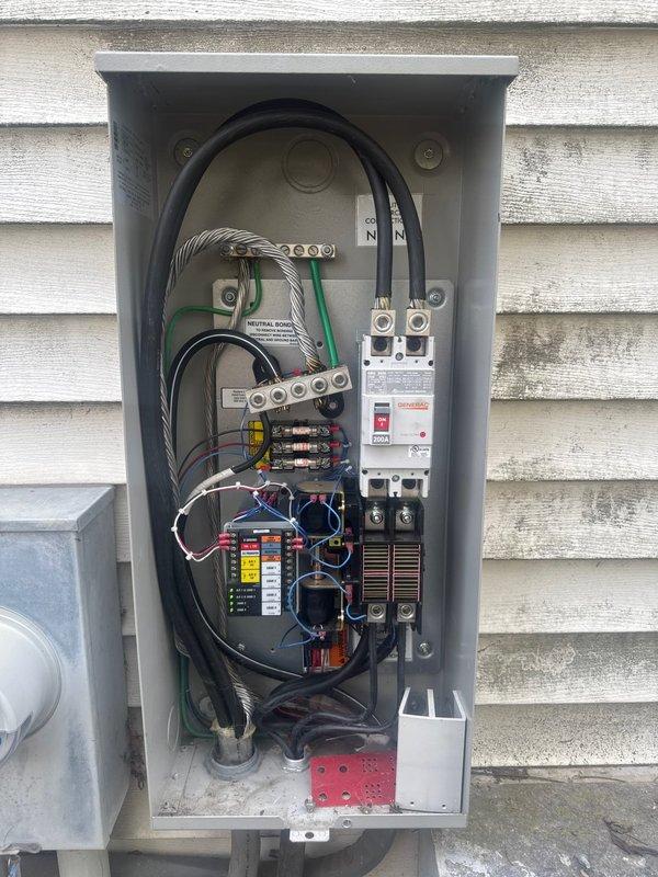 Performed routine maintenance on a 22kW natural gas standby generator with unknown service history. Inspected electrical service panel, verified all circuit breaker connections, grounding systems, and wiring integrity. Documented existing conditions with photographs for service records.