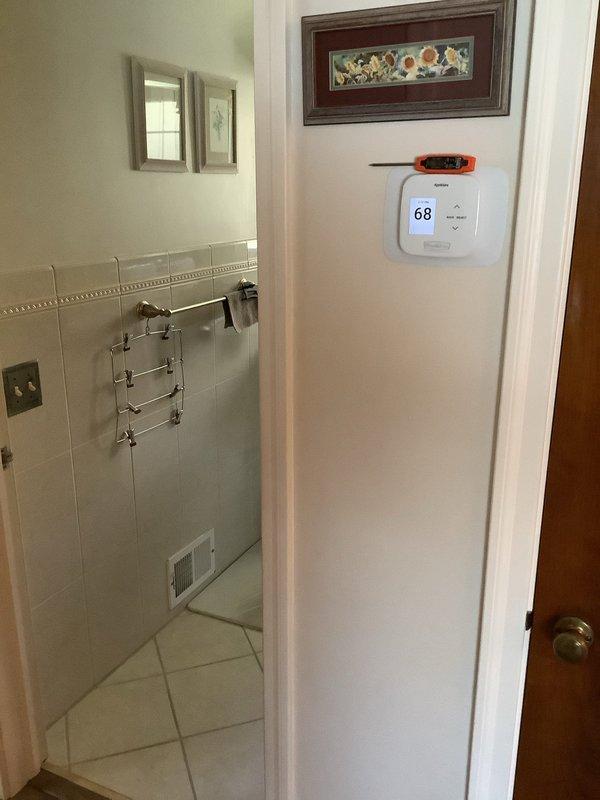 Responded to follow-up call from previous service visit regarding shut-off valve. Diagnosed temperature inconsistency between rooms and addressed customer concerns about dust despite previous duct cleaning. Verified thermostat was functioning properly and set at 68°F. Determined dust issue unrelated to HVAC system.