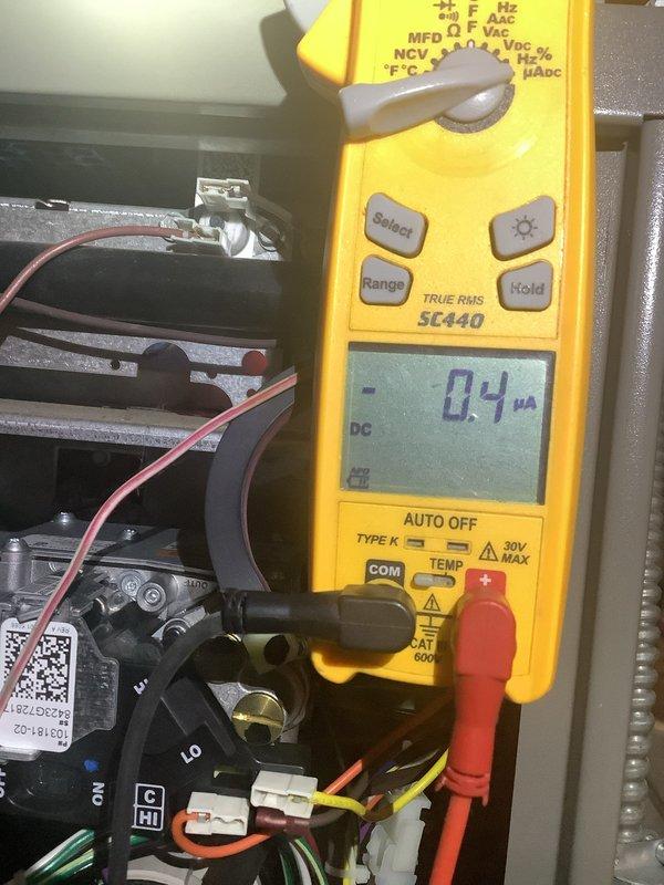 Diagnosed furnace failure on 3-4 year old unit. Performed microamp test using Fieldpiece SC440 multimeter, which revealed flame sensor current of 0.4 μA DC, significantly below minimum operational threshold. Cleaned flame sensor, restored proper flame detection, and verified normal system operation through complete heating cycle.