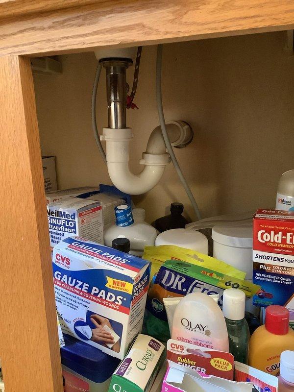 Conducted inspection of bathroom sink plumbing system. Examined under-sink cabinet area containing P-trap assembly and drain connections. No leaks or malfunctions identified in the white PVC P-trap or metal drain assembly components.
