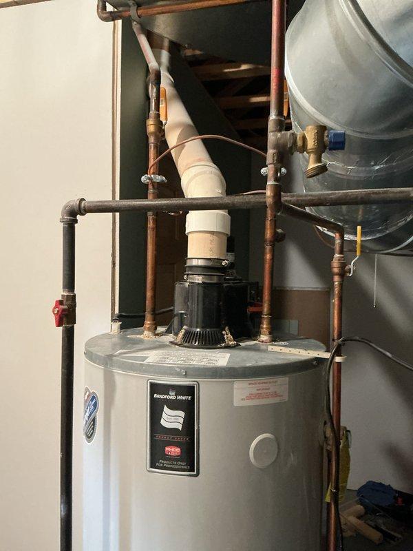 Successfully replaced leaking water heater with new Bradford White tank model. Installed new PVC piping connections and verified proper function of all valves including the red shut-off valve. System is now operational with no leaks detected.