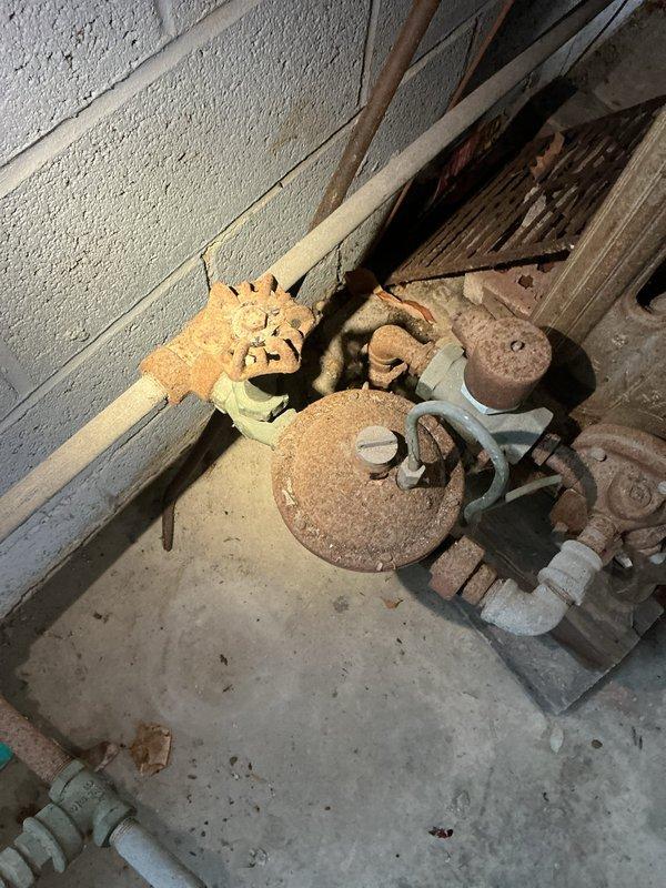 Removed severely corroded radiator from garage as requested by customer. Disconnected unit from existing plumbing system and capped lines to prevent leaks. Documented condition of aged valve assembly and surrounding piping which showed significant rust formation and deterioration.