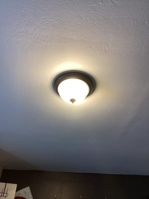Successfully installed ceiling-mounted light fixture with dome-shaped glass shade and bronze trim ring. Completed electrical box installation and verified proper illumination. Fixture securely attached to textured ceiling with no visible issues.