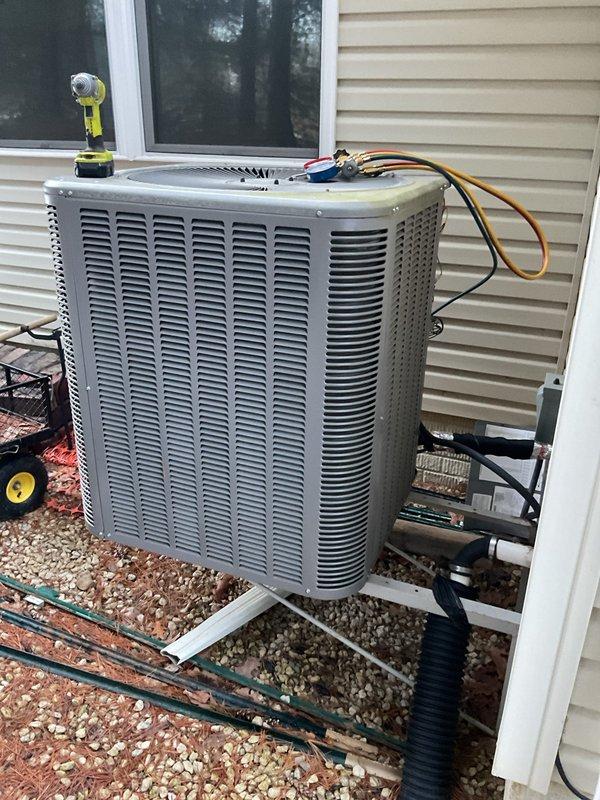 Successfully completed heat pump replacement with installation of new Lennox outdoor unit on concrete pad with proper drainage. System was properly connected to existing electrical and refrigerant lines, with all connections tested and verified for optimal performance.