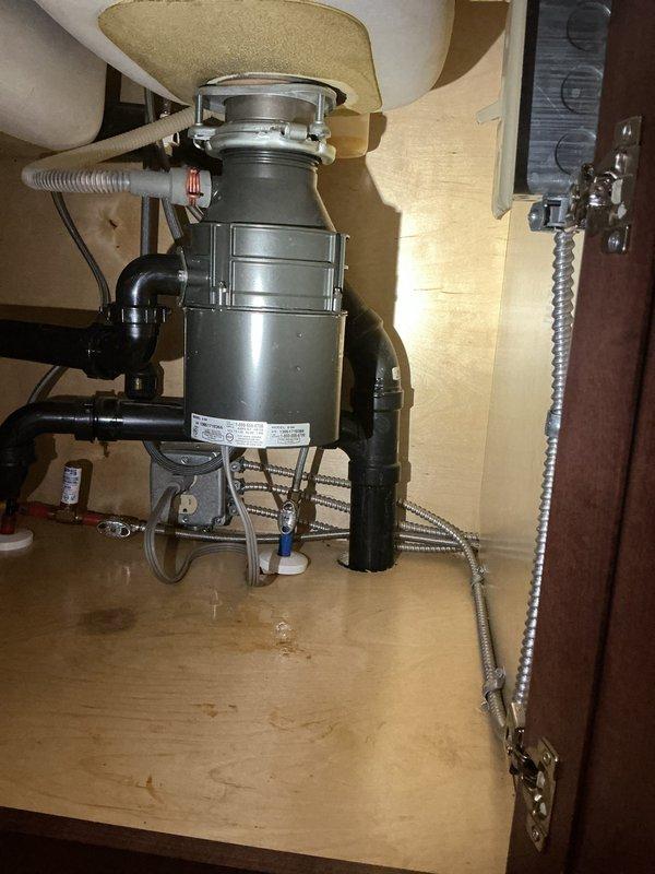 Resolved significant leak at garbage disposal unit under kitchen sink that was causing water accumulation and cabinet damage. Diagnosed failing disposal seal as the source of the leak, replaced unit with new model, and verified proper operation. All connections were tested for leaks, ensuring full functionality of both sink basins.