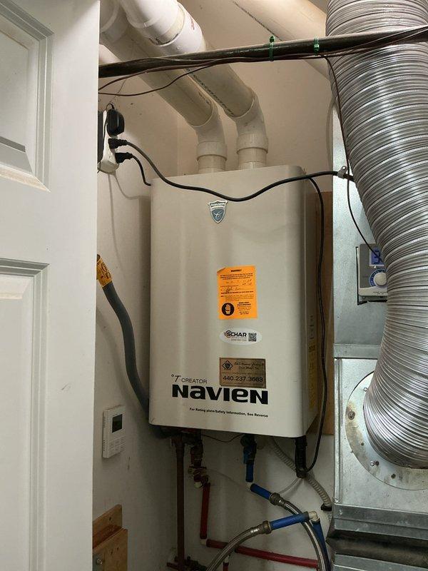Successfully completed installation of a Navien tankless water heater in utility closet, including proper connection of water supply lines, gas line, and electrical components. System was fully vented using PVC piping, and all connections were tested to ensure proper operation and safety compliance.