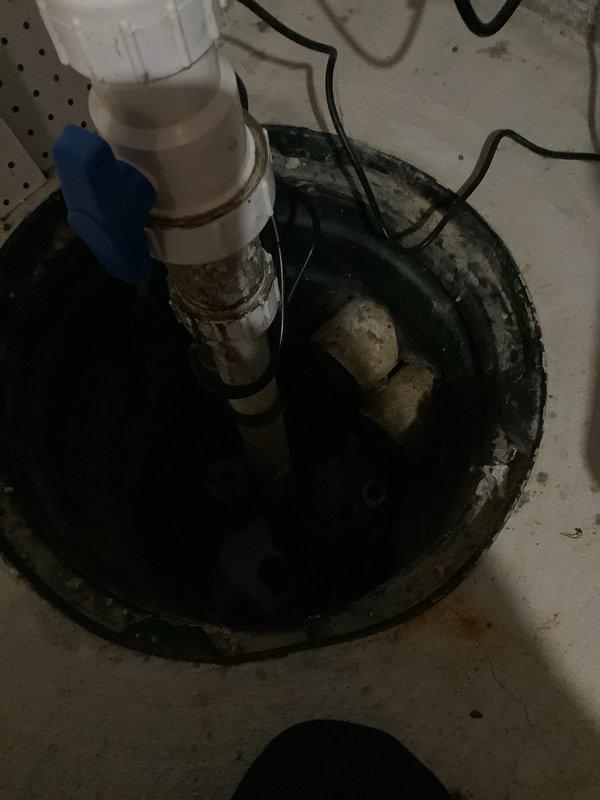 Responded to service call for sump pump concerns regarding unknown discharge location and dry basin conditions. Upon inspection, found sump pump system installed in basement with white PVC discharge piping assembly extending upward from circular black basin. Verified pump electrical connections, float switch operation, and basin integrity. System appeared functional with no active water infiltration at time of inspection, explaining dry basin condition. Advised customer on typical discharge routing and recommended monitoring during next rainfall event to confirm proper drainage pathway and system operation.