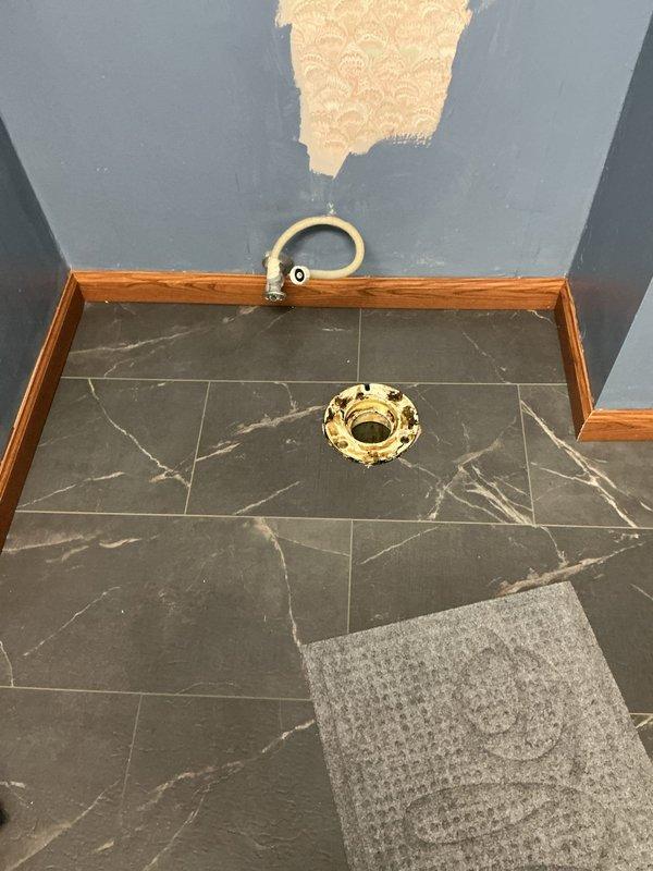 Successfully installed new toilet in family room bathroom with existing plumbing connections. Completed installation prior to customer's new bathroom floor installation as requested, ensuring proper seal at the brass toilet flange and connection to the existing gold water supply line.