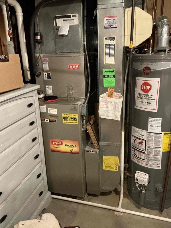 Completed estimate for Bryant furnace and AC replacement (Quote #02276-04 and #02276-01). Assessed current system including Bryant PLUS 95i furnace and documented existing installation alongside Rheem Performance water heater. Photographed complete mechanical room setup for accurate replacement specifications.
