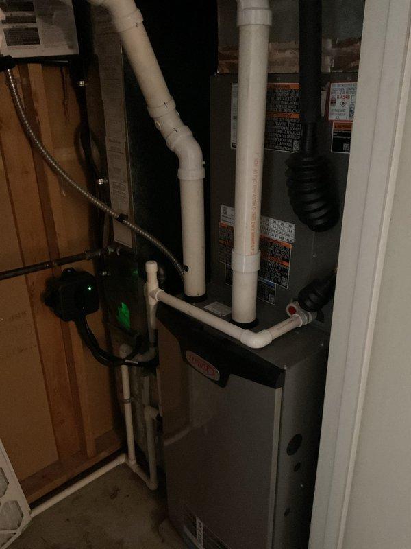 Completed installation of a 90% AFUE furnace in residential basement location. Installed new air handler unit with integrated humidifier system and connected white PVC venting for condensate drainage. Mounted carbon monoxide alarm in utility area per code requirements to ensure safe operation of new gas-fired equipment. All ductwork connections secured and system tested for proper operation.