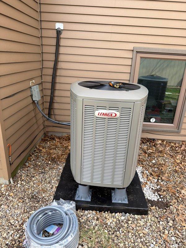 Completed full HVAC system installation including outdoor Lennox heat pump condensing unit and indoor air handler. Positioned heat pump on composite pad with proper gravel base for drainage and stability. Installed electrical disconnect box with appropriate conduit routing and grounding per code requirements. All refrigerant lines connected and system tested for proper operation.