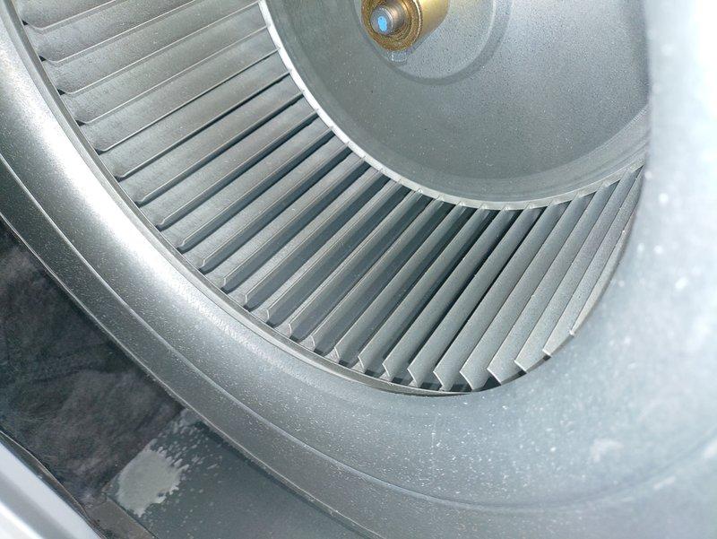 Performed scheduled maintenance visit on heating system. Inspected blower wheel assembly, which was found to be in good working condition with no visible damage. Noted minor moisture presence around the housing that may require monitoring in future visits.