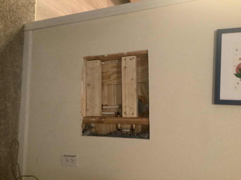 Relocated tub valve assembly to center alignment with existing tile opening and adjusted backing support toward tub to achieve proper installation depth. Installed new 1/2" PEX supply lines and repositioned valve mounting to accommodate extended tub spout requirements, ensuring adequate spout protrusion from finished wall surface.