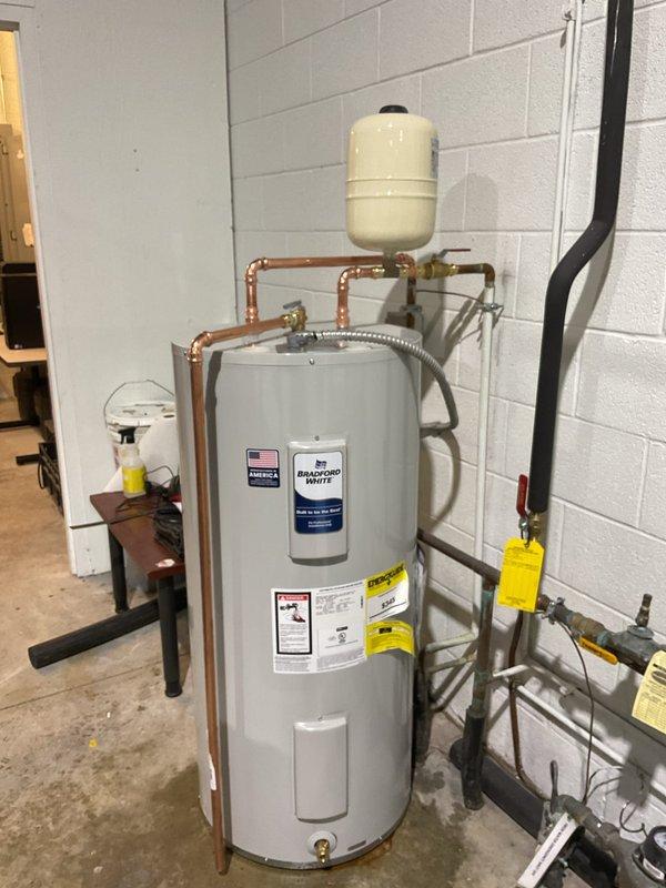 Installed a new 40-gallon Bradford White water heater in customer's utility room, which included mounting an expansion tank and properly connecting all copper supply lines. All installation was completed per specifications with appropriate tags affixed and system tested for proper operation.