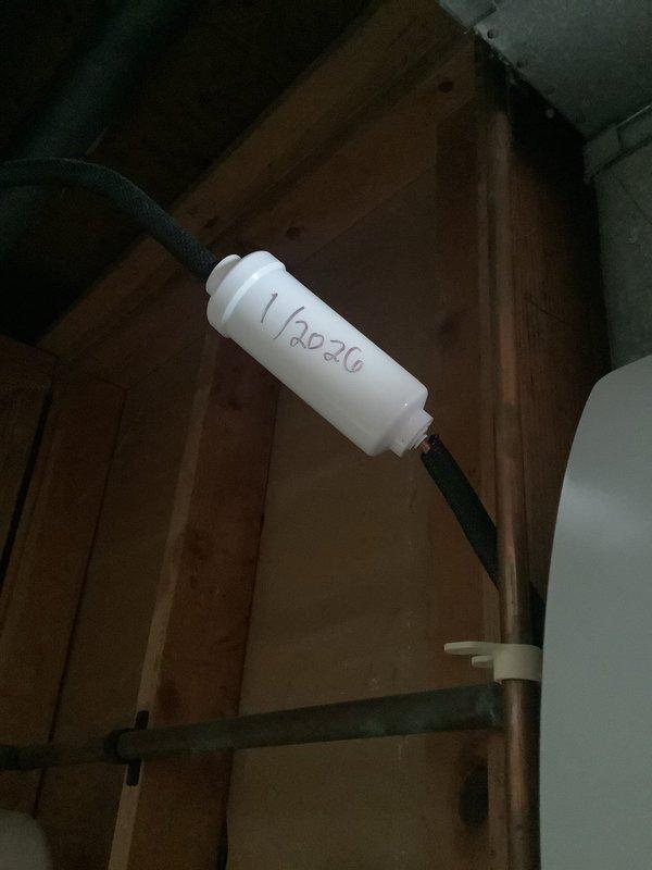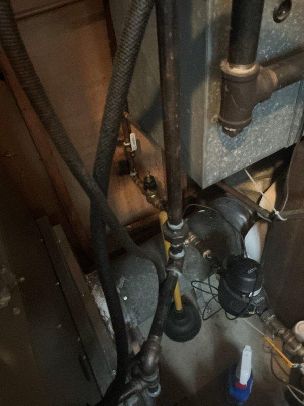 Completed humidifier installation with new plumbing connections integrated into the existing HVAC system. Installation included PVC piping with proper drainage configuration and connection to the home's water supply. System was tested and verified operational with all components properly secured.