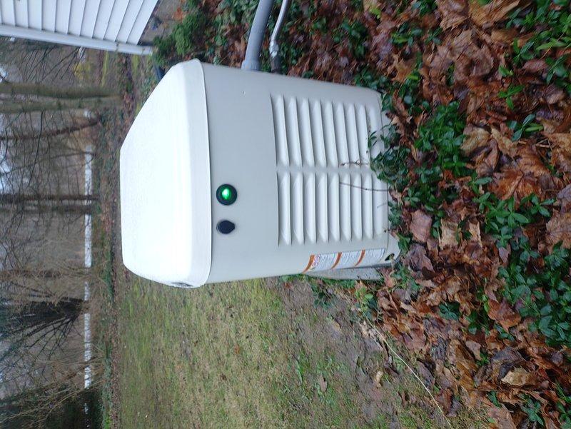 Inspected residential generator showing split yellow/green indicator light. Visual examination confirmed proper installation with functional ventilation grilles and control panel. Unit appears to be operating normally as the dual-colored indicator light signifies standby mode; no service intervention required at this time.